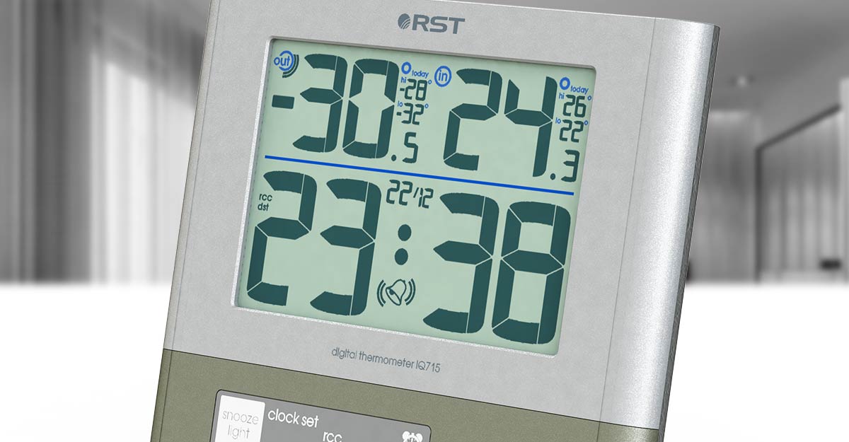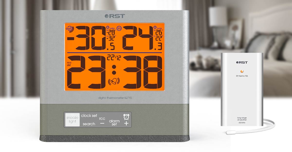 Цифровой термометр IQ715 принимает сигнал о внешней температуре от радиодатчика RST02706, работающего на частоте 433 мГц.