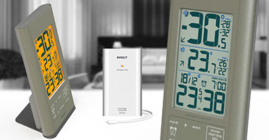 большой контрастный ЖК дисплей система hi/lo Daily Ctrl - автоматическое запоминание и индикация максимальной и минимальной температур воздуха на улице и в помещении за текущие сутки • приятная оранжевая подсветка дисплея • часы с системой коррекции времени по радиосигналам точного времени rcc 77,5 kHz (предустановлен часовой пояс для Москвы) система "dst" автоматический переход на "зимнее"/"летнее" время с возможностью отключения • температура вне помещения, передаваемая на базовый блок от автономного радиодатчика RST02706 работающего на частоте ена расстоянии до 60 метров (на открытом пространстве, при отсутствии помех) с указанием тенденции ее изменения система автоматического мониторинга температур полученных с радиодатчика температура воздуха внутри помещения • индикатор состояния батареи базовой станции и радиодатчика • базовая станция и радиодатчик устанавливаются на столе и имеют настенное крепление