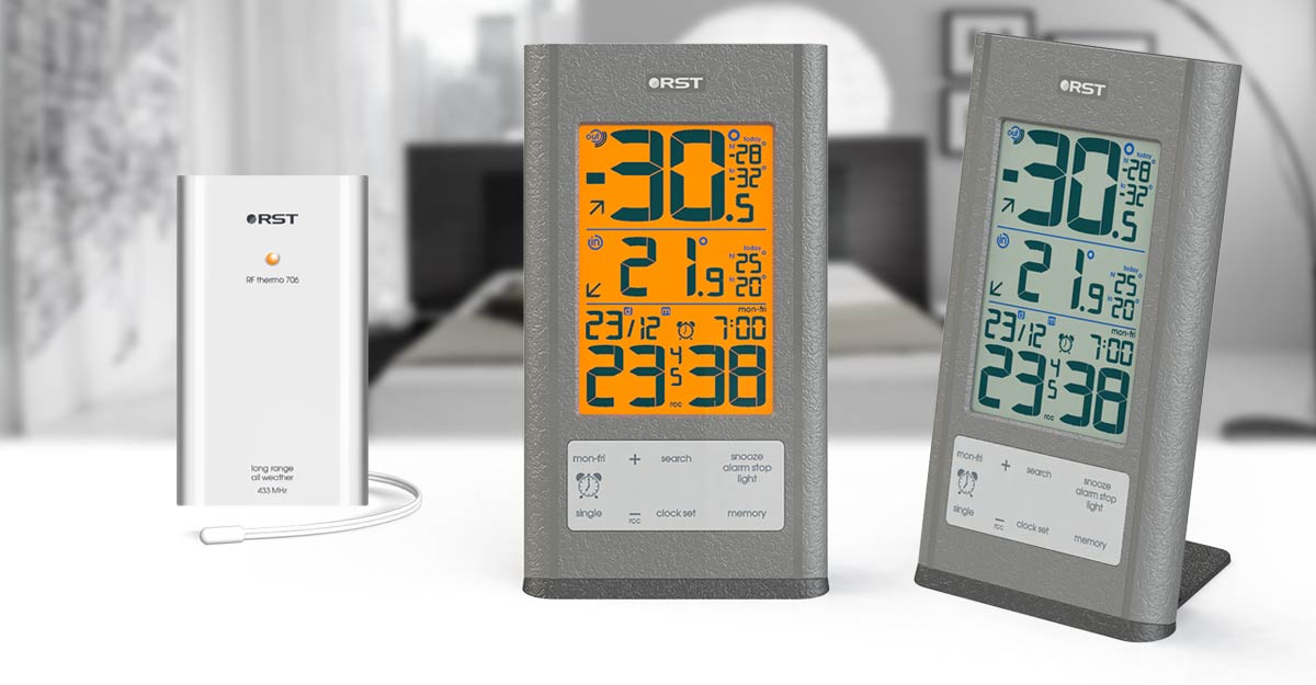 большой контрастный ЖК дисплей система hi/lo Daily Ctrl - автоматическое запоминание и индикация максимальной и минимальной температур воздуха на улице и в помещении за текущие сутки • приятная оранжевая подсветка дисплея • часы с системой коррекции времени по радиосигналам точного времени rcc 77,5 kHz (предустановлен часовой пояс для Москвы) система "dst" автоматический переход на "зимнее"/"летнее" время с возможностью отключения • температура вне помещения, передаваемая на базовый блок от автономного радиодатчика RST02706 работающего на частоте ена расстоянии до 60 метров (на открытом пространстве, при отсутствии помех) с указанием тенденции ее изменения система автоматического мониторинга температур полученных с радиодатчика температура воздуха внутри помещения • индикатор состояния батареи базовой станции и радиодатчика • базовая станция и радиодатчик устанавливаются на столе и имеют настенное крепление