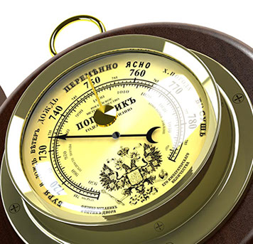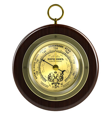 Барометр с изображением Российского герба и морской атрибутики стилизован под встраиваемые морские судовые барометры.