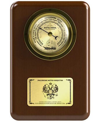 Барометр с изображением парусника "Крузенштерн", Российского герба и морской атрибутики стилизован под встраиваемые морские судовые барометры.