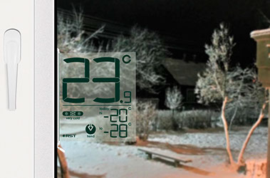 Цифровые термометры с большим прозрачным дисплеем, предназначенные для установки за окном на стекле или на раме. Огромные цифры термометров хорошо видны в любой точке кухни или комнаты. В термометрах реализована функция автоматического запоминания максимальных и минимальных температур. В некоторых моделях предусмотрено измерение относительной влажности воздуха.