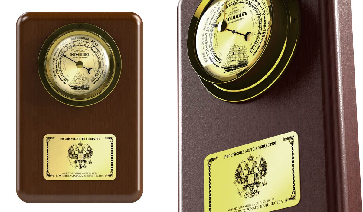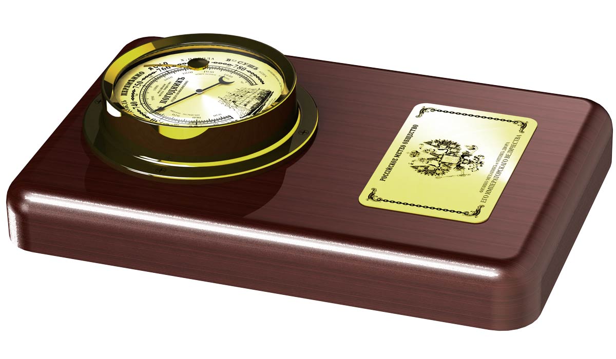Барометр с изображением парусника "Крузенштерн", Российского герба и морской атрибутики стилизован под встраиваемые морские судовые барометры.