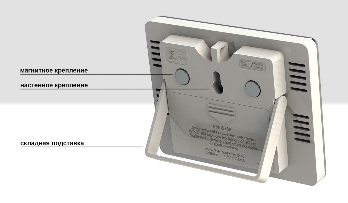 большой контрастный ЖК дисплей система hi/lo Daily Ctrl - автоматическое запоминание и индикация максимальной и минимальной температур воздуха на улице и в помещении за текущие сутки • температура вне помещения, передаваемая на базовый блок от автономного радиодатчика RST02252 работающего на частоте 733 мГц на расстоянии до 30 метров (на открытом пространстве, при отсутствии помех) с указанием тенденции ее изменения система автоматического мониторинга температур полученных с радиодатчика температура воздуха внутри помещения • индикатор состояния батареи базовой станции и радиодатчика • базовая станция и радиодатчик устанавливаются на столе и имеют настенное крепление • термометр может быть закреплен на металлической поверхности посредством магнитов