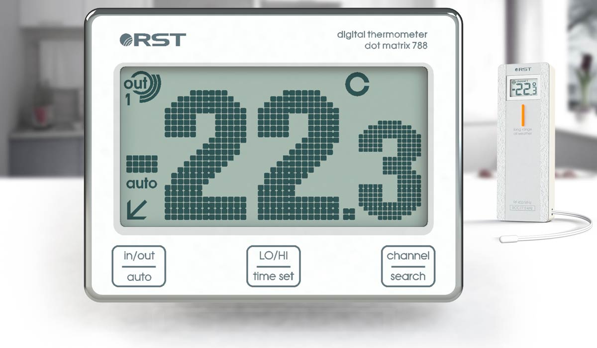 Цифровой термометр dot matrix 780 принимает сигнал о внешней температуре от радиодатчика RST02252, работающего на частоте 433 мГц.